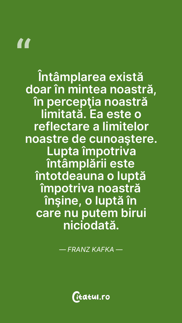 Întâmplarea există doar în mintea noastră, în percepţia noastră limitată. Ea este o reflectare a limitelor noastre de cunoaştere. Lupta împotriva întâmplării este întotdeauna o luptă împotriva noastră înşine, o luptă în care nu putem birui niciodată. Franz Kafka