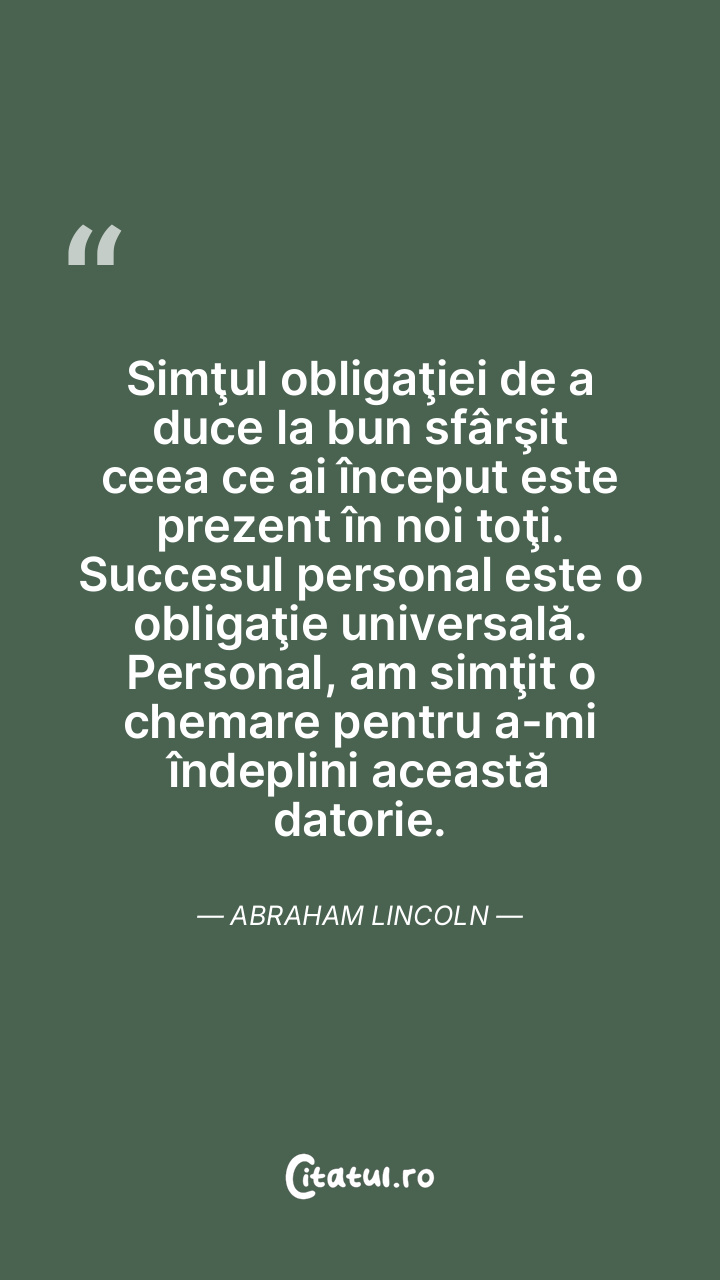 Simţul obligaţiei de a duce la bun sfârşit ceea ce ai început este prezent în noi toţi. Succesul personal este o obligaţie universală. Personal, am simţit o chemare pentru a-mi îndeplini această datorie. Abraham Lincoln