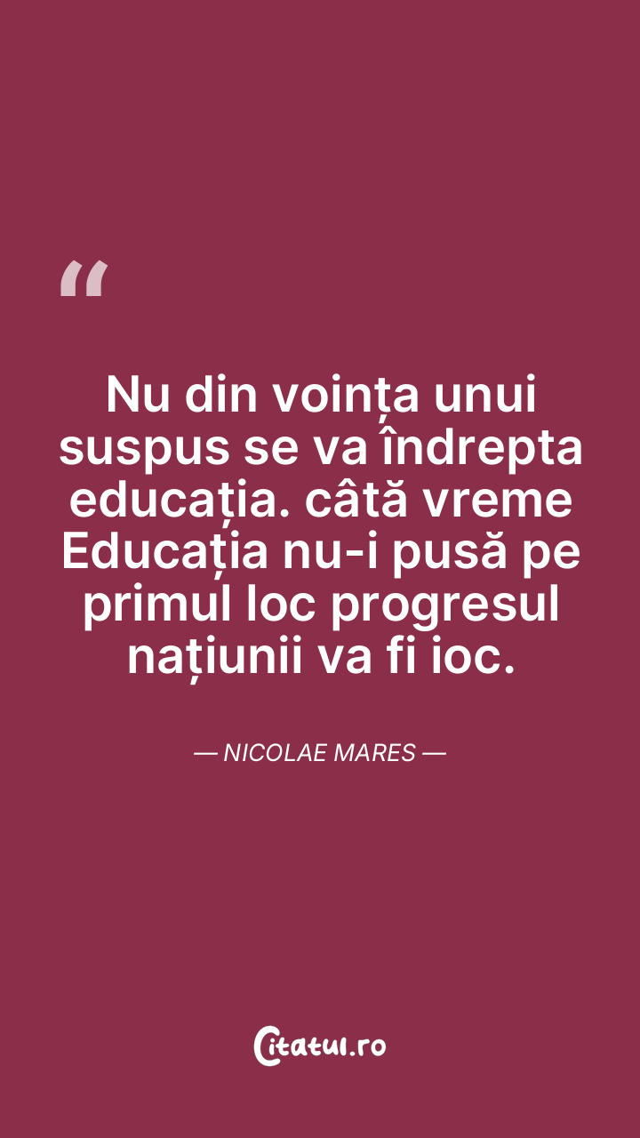 Nu din voința unui suspus se va îndrepta educația. câtă vreme Educația nu-i pusă pe primul loc progresul națiunii va fi ioc. Nicolae Mares