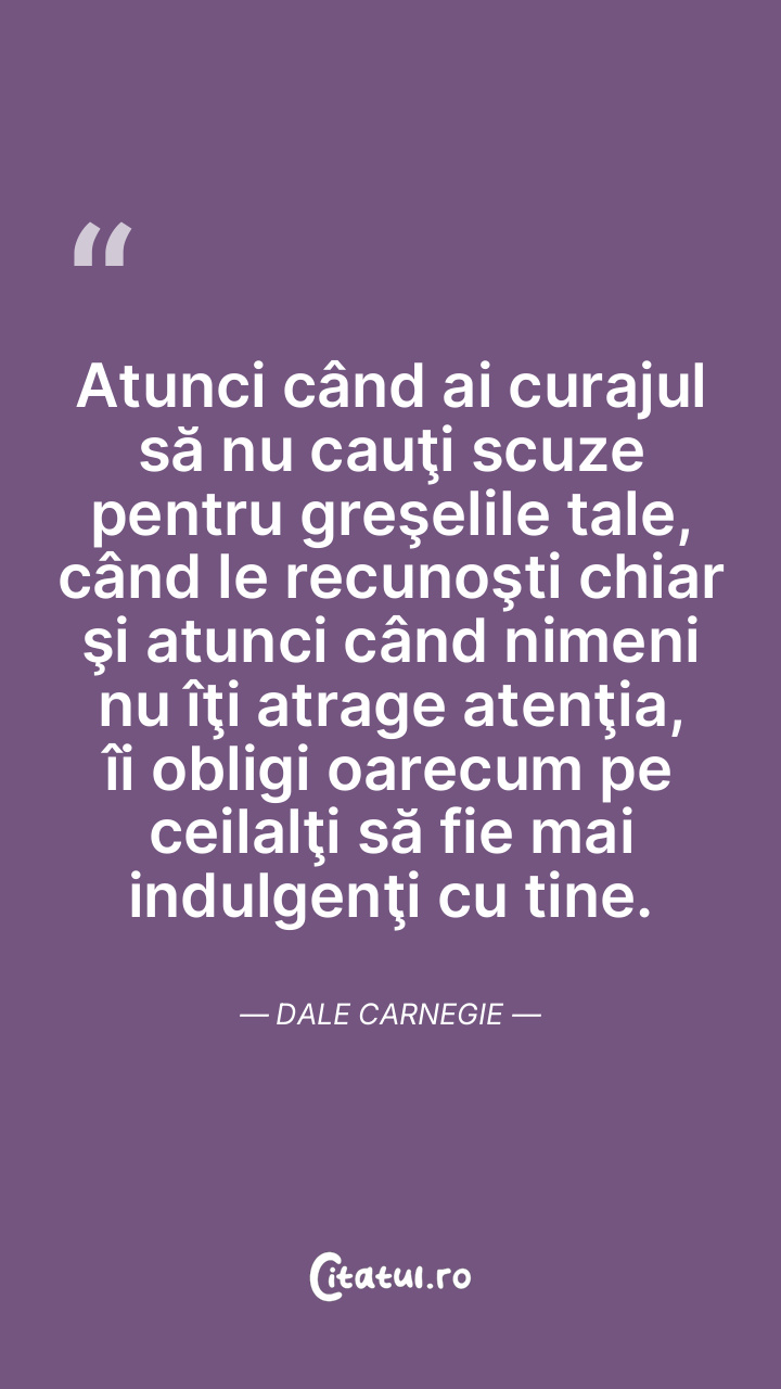 Atunci când ai curajul să nu cauţi scuze pentru greşelile tale, când le recunoşti chiar şi atunci când nimeni nu îţi atrage atenţia, îi obligi oarecum pe ceilalţi să fie mai indulgenţi cu tine. Dale Carnegie