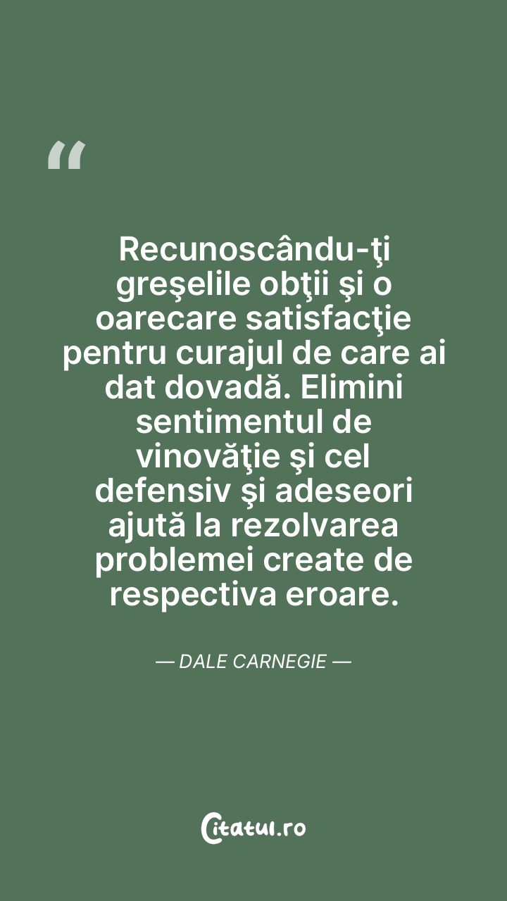Recunoscându-ţi greşelile obţii şi o oarecare satisfacţie pentru curajul de care ai dat dovadă. Elimini sentimentul de vinovăţie şi cel defensiv şi adeseori ajută la rezolvarea problemei create de respectiva eroare. Dale Carnegie