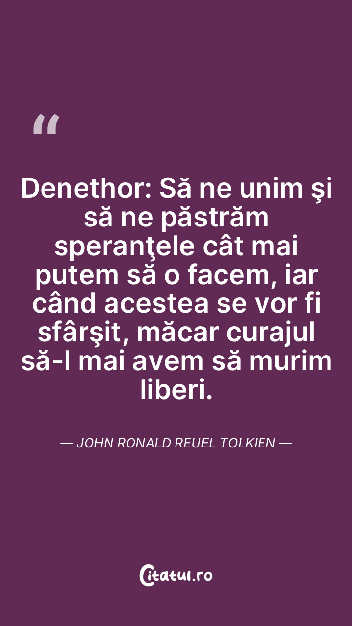 Denethor: Să ne unim şi să ne păstrăm speranţele cât mai putem să o facem, iar când acestea se vor fi sfârşit, măcar curajul să-l mai avem să murim liberi. John Ronald Reuel Tolkien