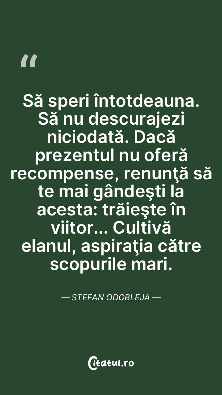 Să speri întotdeauna. Să nu descurajezi niciodată. Dacă prezentul nu oferă recompense, renunţă să te mai gândeşti la acesta: trăieşte în viitor... Cultivă elanul, aspiraţia către scopurile mari. Stefan Odobleja