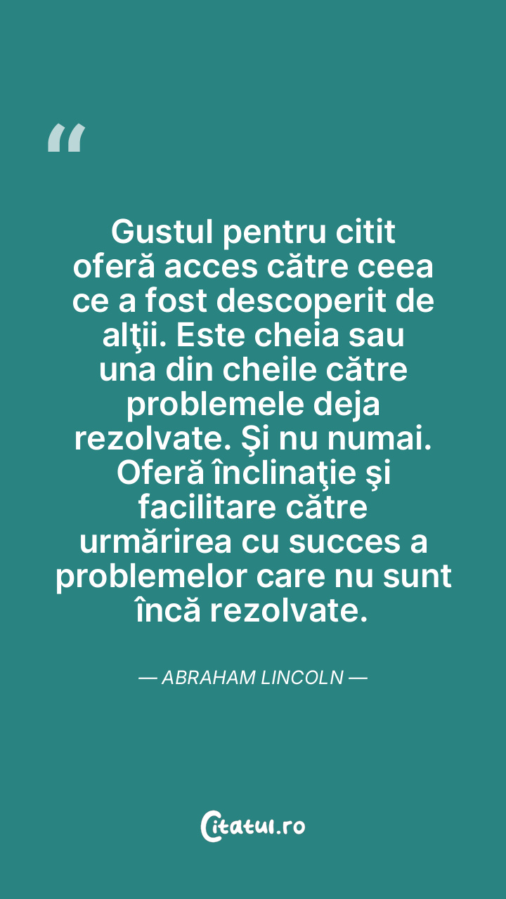 Gustul pentru citit oferă acces către ceea ce a fost descoperit de alţii. Este cheia sau una din cheile către problemele deja rezolvate. Şi nu numai. Oferă înclinaţie şi facilitare către urmărirea cu succes a problemelor care nu sunt încă rezolvate. Abraham Lincoln