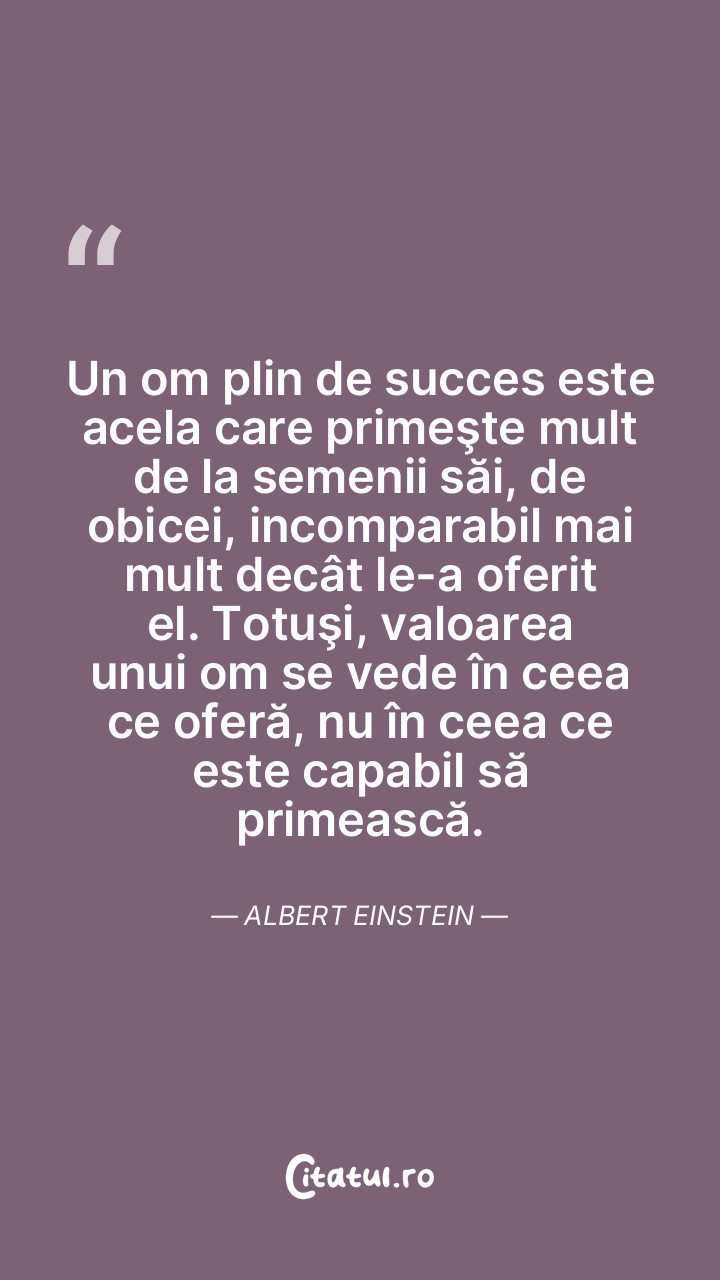 Un om plin de succes este acela care primeşte mult de la semenii săi, de obicei, incomparabil mai mult decât le-a oferit el. Totuşi, valoarea unui om se vede în ceea ce oferă, nu în ceea ce este capabil să primească. Albert Einstein