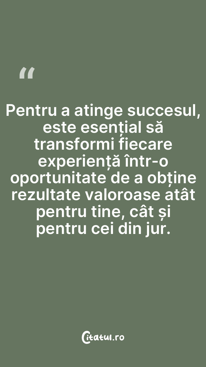Pentru a atinge succesul, este esențial să transformi fiecare experiență într-o oportunitate de a obține rezultate valoroase atât pentru tine, cât și pentru cei din jur.