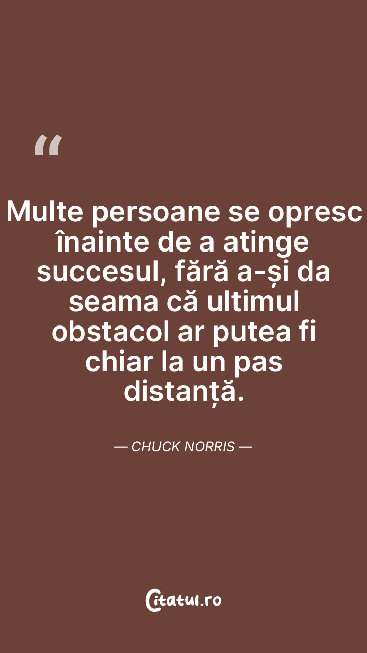 Multe persoane se opresc înainte de a atinge succesul, fără a-și da seama că ultimul obstacol ar putea fi chiar la un pas distanță. Chuck Norris