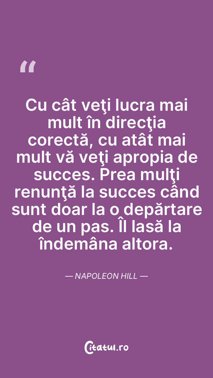Cu cât veţi lucra mai mult în direcţia corectă, cu atât mai mult vă veţi apropia de succes. Prea mulţi renunţă la succes când sunt doar la o depărtare de un pas. Îl lasă la îndemâna altora. Napoleon Hill