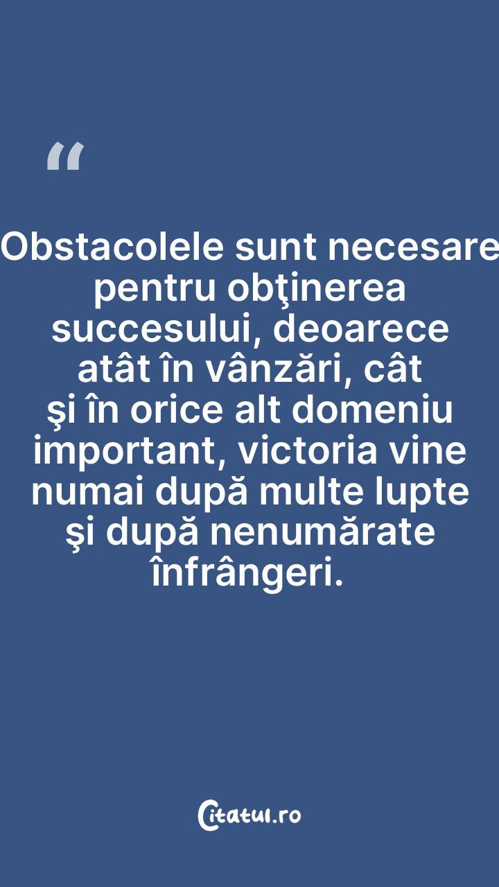Obstacolele sunt necesare pentru obţinerea succesului, deoarece atât în vânzări, cât şi în orice alt domeniu important, victoria vine numai după multe lupte şi după nenumărate înfrângeri.
