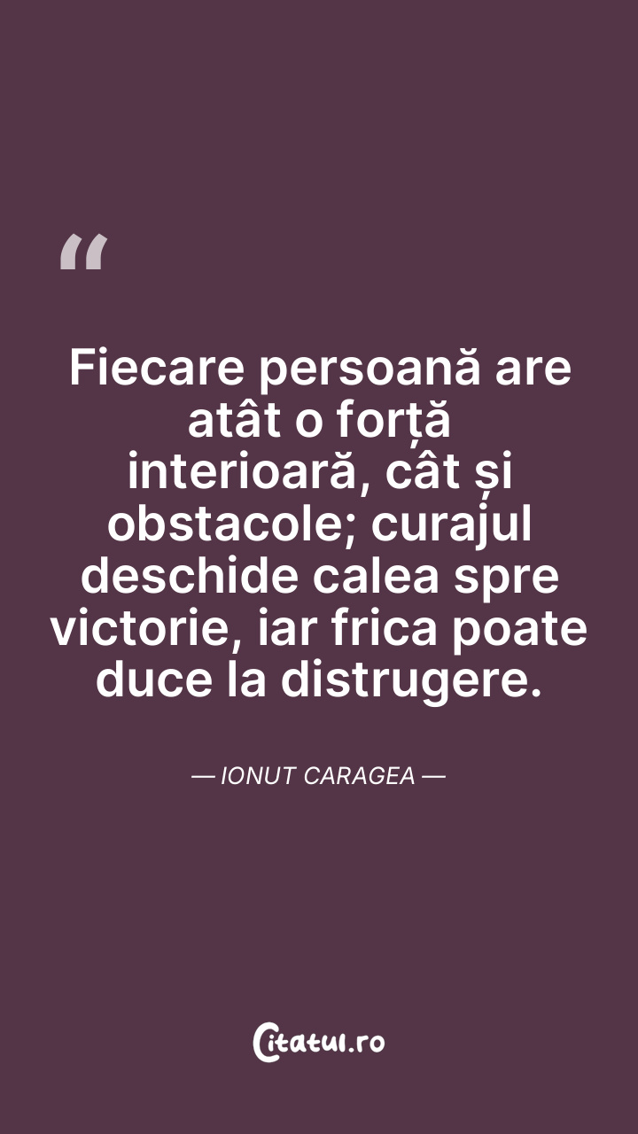 Fiecare persoană are atât o forță interioară, cât și obstacole; curajul deschide calea spre victorie, iar frica poate duce la distrugere. Ionut Caragea