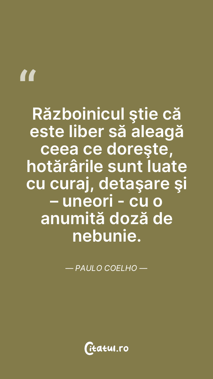 Războinicul ştie că este liber să aleagă ceea ce doreşte, hotărârile sunt luate cu curaj, detaşare şi – uneori - cu o anumită doză de nebunie. Paulo Coelho