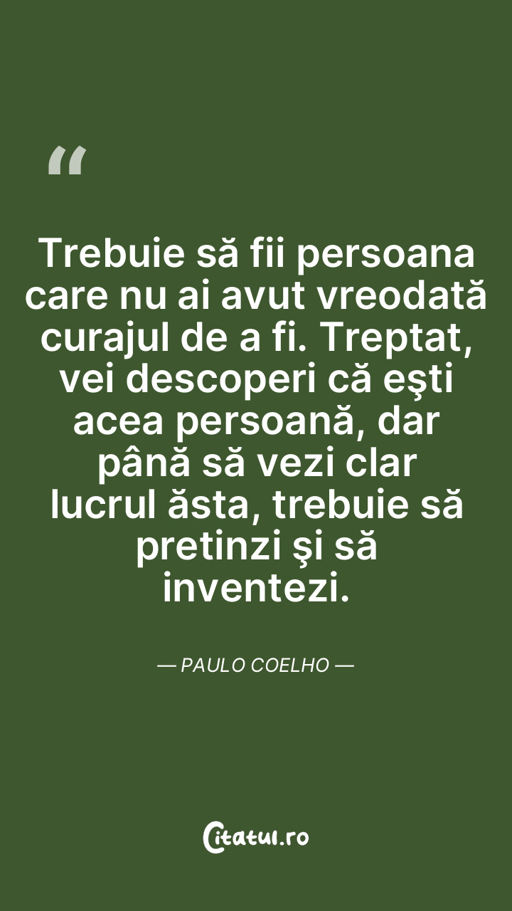 Trebuie să fii persoana care nu ai avut vreodată curajul de a fi. Treptat, vei descoperi că eşti acea persoană, dar până să vezi clar lucrul ăsta, trebuie să pretinzi şi să inventezi. Paulo Coelho