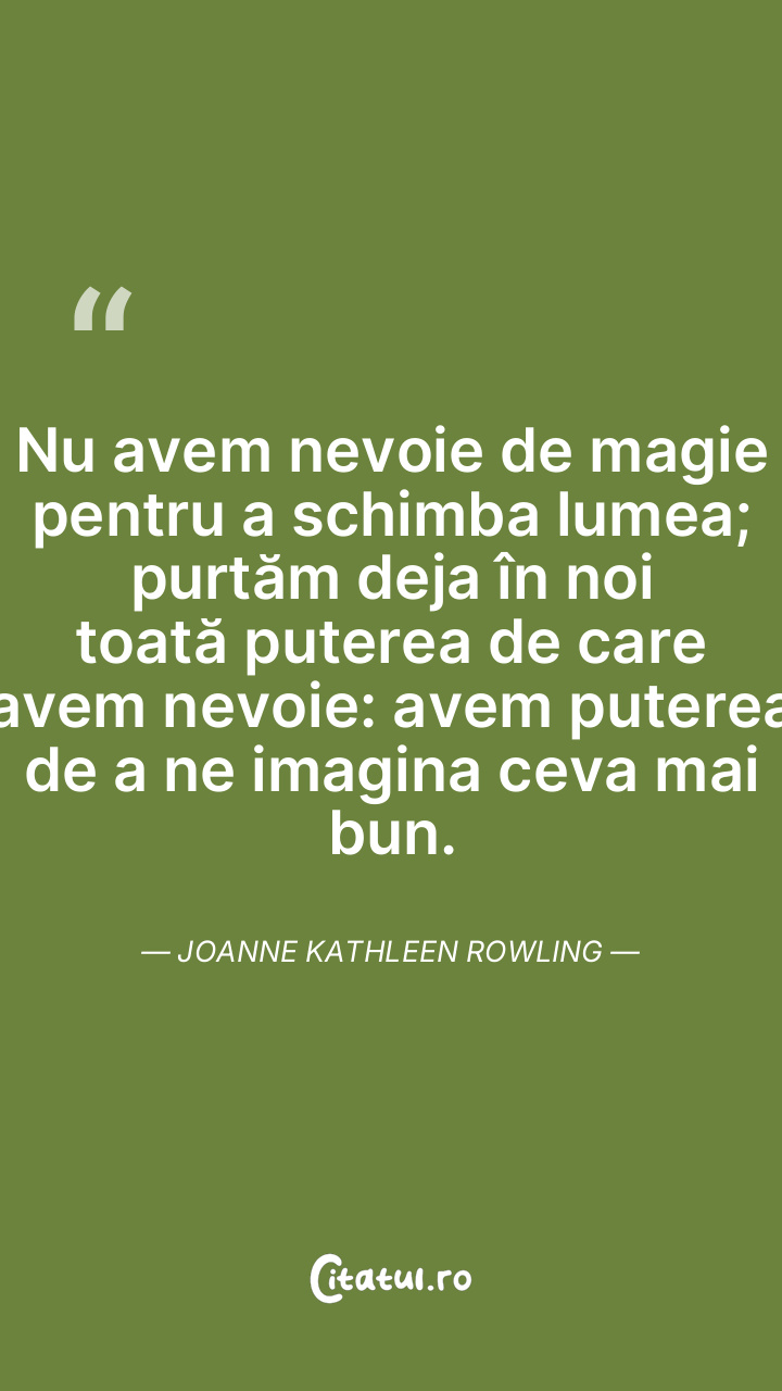 Nu avem nevoie de magie pentru a schimba lumea; purtăm deja în noi toată puterea de care avem nevoie: avem puterea de a ne imagina ceva mai bun. Joanne Kathleen Rowling