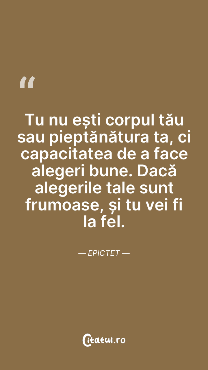 Tu nu ești corpul tău sau pieptănătura ta, ci capacitatea de a face alegeri bune. Dacă alegerile tale sunt frumoase, și tu vei fi la fel. Epictet