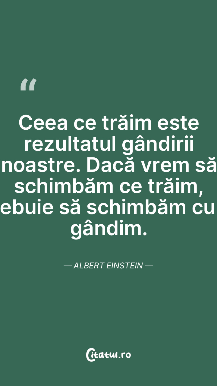 Ceea ce trăim este rezultatul gândirii noastre. Dacă vrem să schimbăm ce trăim, trebuie să schimbăm cum gândim. Albert Einstein