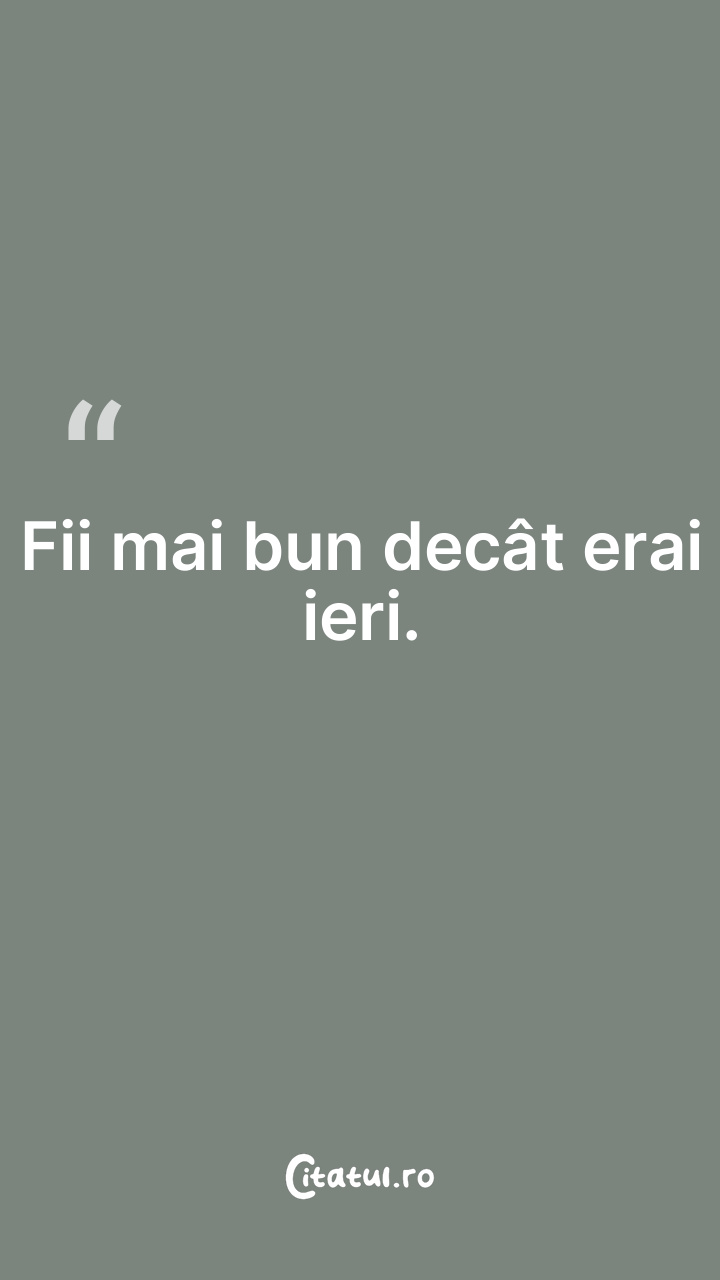 Fii mai bun decât erai ieri. ... Categorie: citate motivationale Dificultate: Foarte ușor de citit! Votează: ★ ★ ★ ★ ★ (0/5 din 0) Distribuiți acest citat? Alegeți platforma preferată: Salvează citatul in telefon/pc Fii mai bun decât erai ieri. Copiază Favorite Eroare