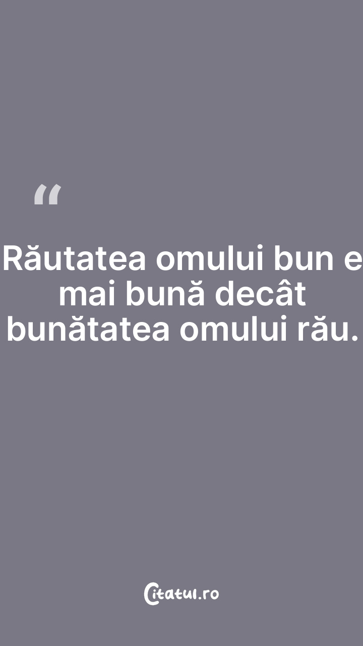 Omul rău nu e bun decât cu el însuşi. ... Categorie: citate oameni Dificultate: Foarte ușor de citit! Votează: ★ ★ ★ ★ ★ (0/5 din 0) Distribuiți acest citat? Alegeți platforma preferată: Salvează citatul in telefon/pc Omul rău nu e bun decât cu el însuşi. Copiază Favorite Eroare
