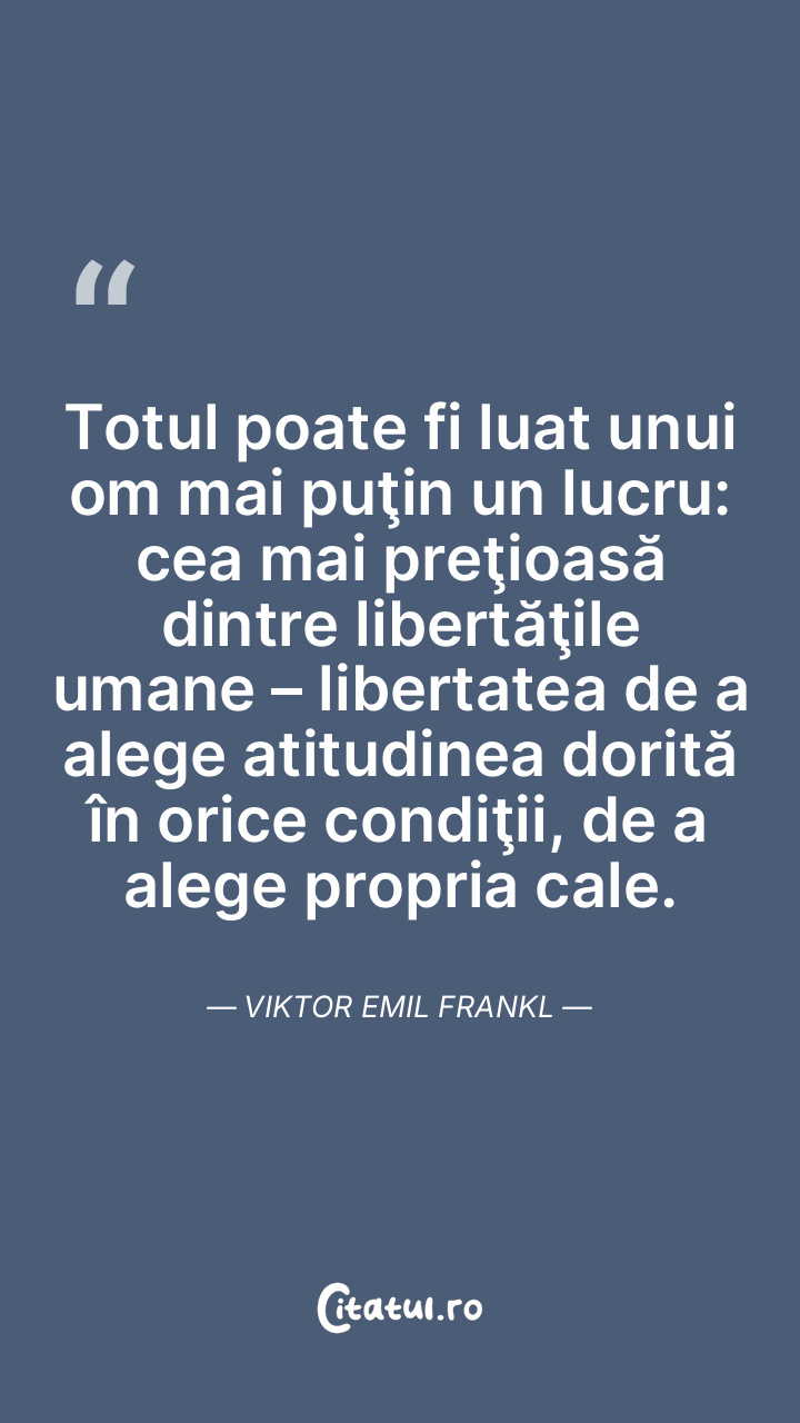 Totul îl poate fi luat unui om, mai puţin un lucru: ultima libertate umană - să îşi aleagă atitudinea în orice condiţii, să îşi aleagă propria cale. Viktor Emil Frankl