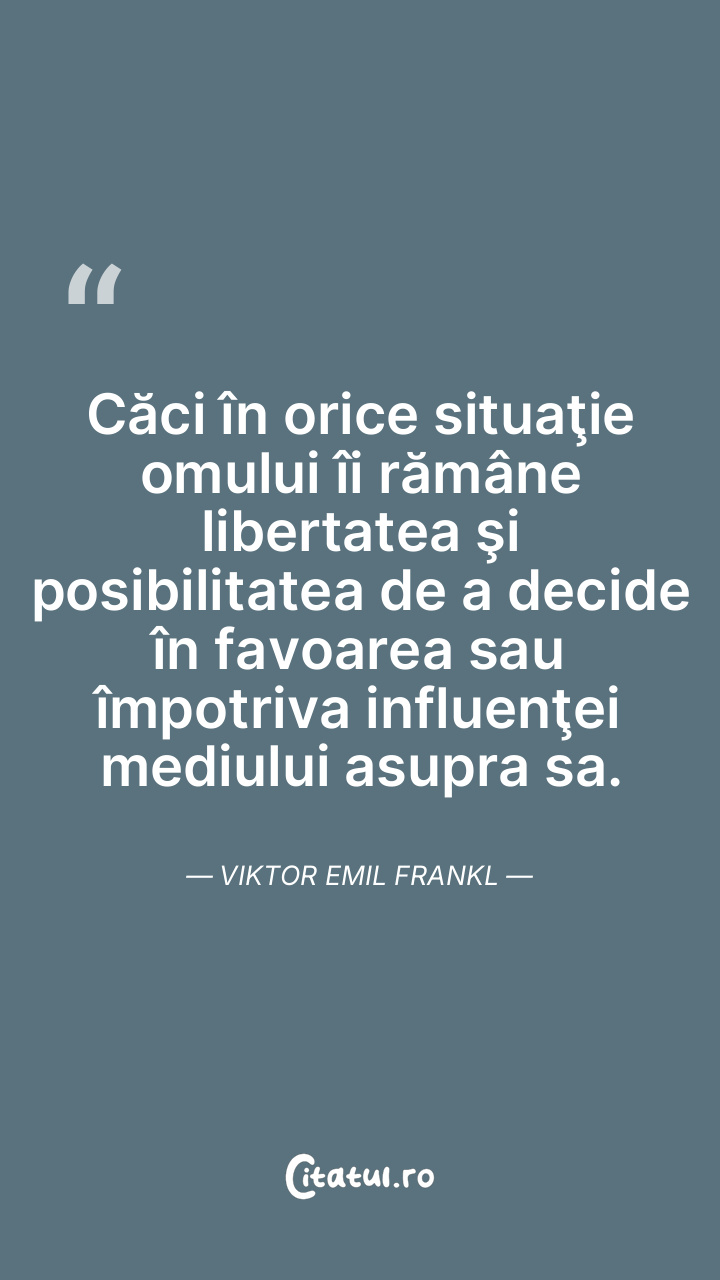 Totul poate fi luat unui om mai puţin un lucru: cea mai preţioasă dintre libertăţile umane – libertatea de a alege atitudinea dorită în orice condiţii, de a alege propria cale. Viktor Emil Frankl