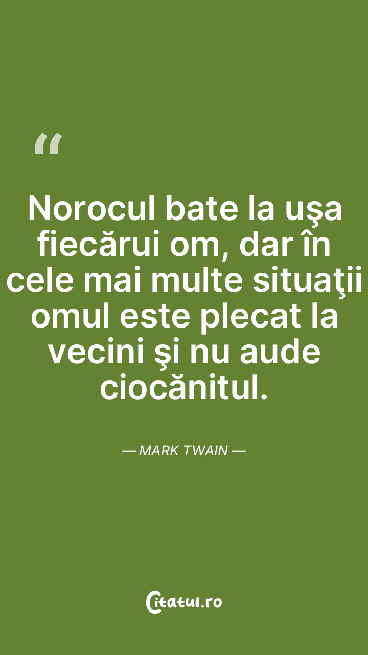 Norocul bate la uşa fiecărui om, dar în cele mai multe situaţii omul este plecat la vecini şi nu aude ciocănitul. Mark Twain