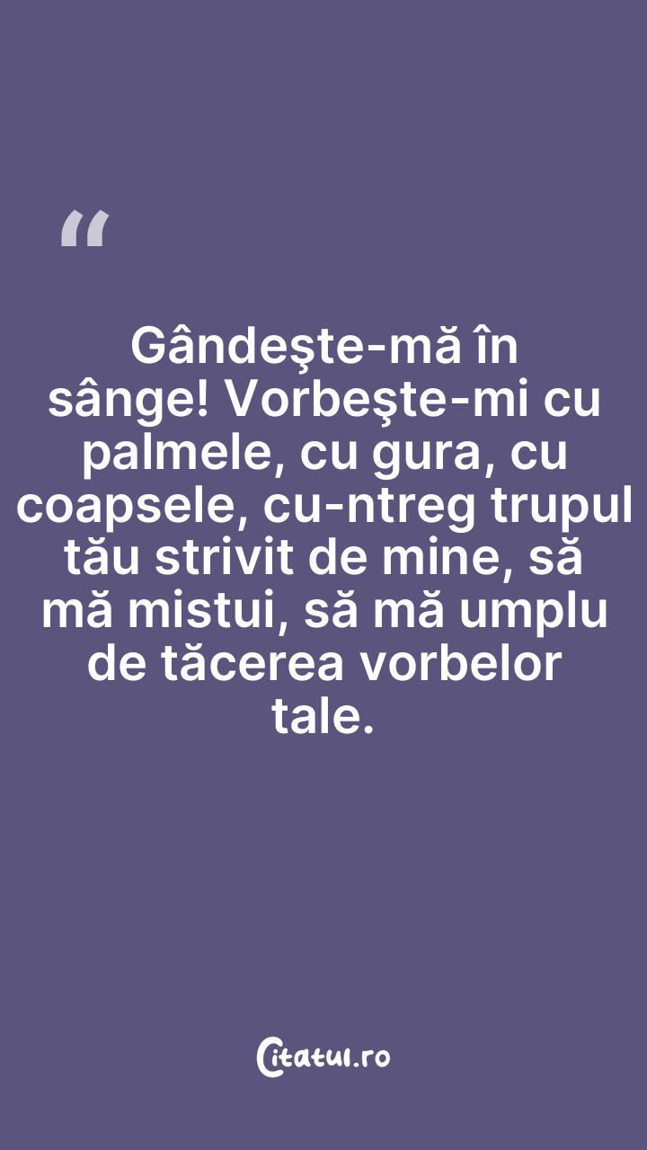 Gândeşte-mă în sânge! Vorbeşte-mi cu palmele, cu gura, cu coapsele, cu-ntreg trupul tău strivit de mine, să mă mistui, să mă umplu de tăcerea vorbelor tale.