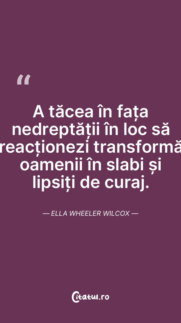 A tăcea în fața nedreptății în loc să reacționezi transformă oamenii în slabi și lipsiți de curaj. Ella Wheeler Wilcox