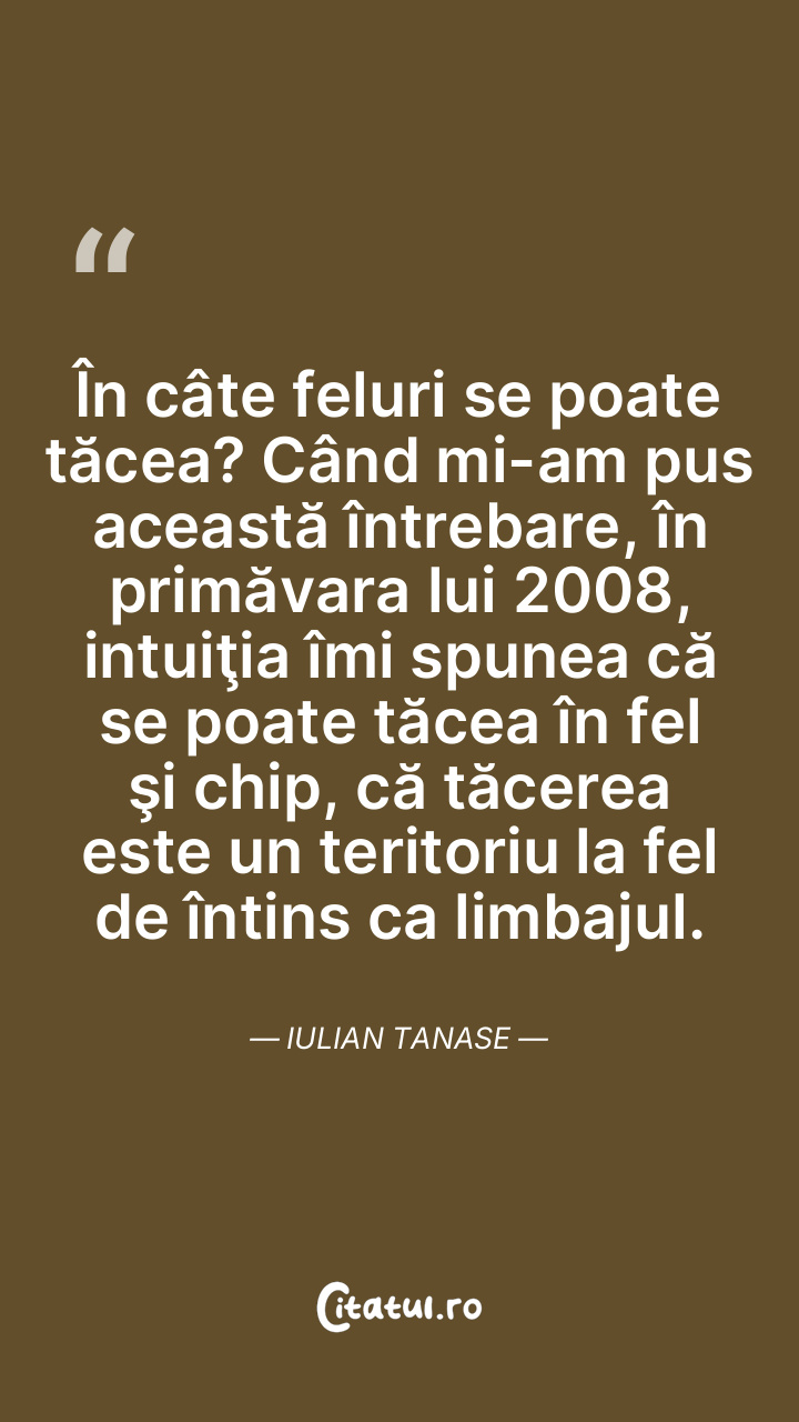 În câte feluri se poate tăcea? Când mi-am pus această întrebare, în primăvara lui 2008, intuiţia îmi spunea că se poate tăcea în fel şi chip, că tăcerea este un teritoriu la fel de întins ca limbajul. Iulian Tanase
