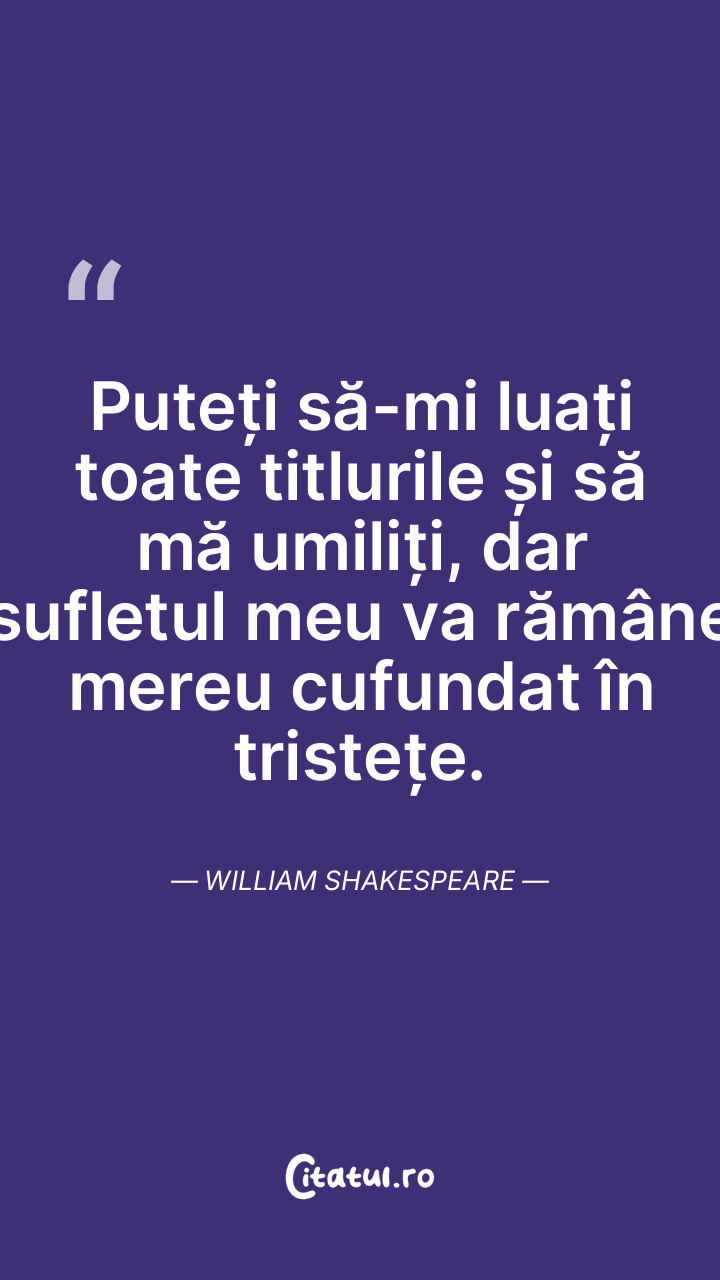 Puteți să-mi luați toate titlurile și să mă umiliți, dar sufletul meu va rămâne mereu cufundat în tristețe. William Shakespeare