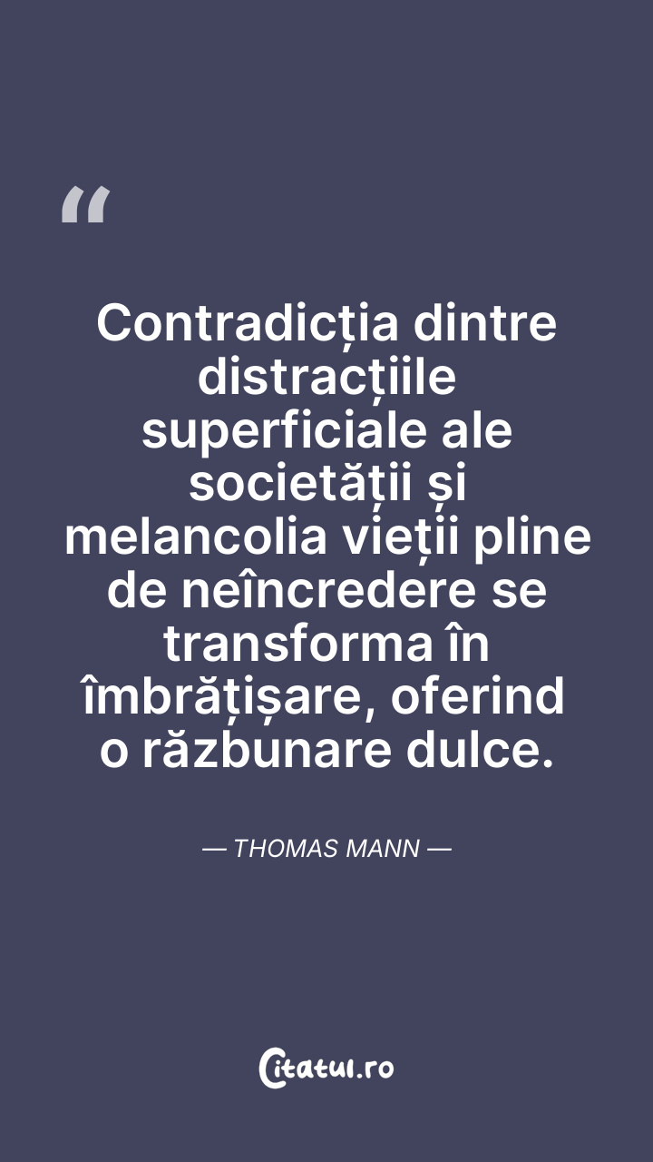 Contradicția dintre distracțiile superficiale ale societății și melancolia vieții pline de neîncredere se transforma în îmbrățișare, oferind o răzbunare dulce. Thomas Mann