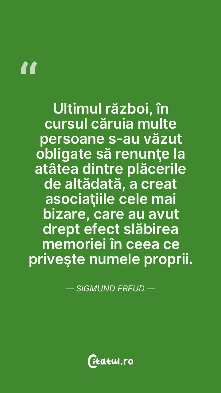 Ultimul război, în cursul căruia multe persoane s-au văzut obligate să renunţe la atâtea dintre plăcerile de altădată, a creat asociaţiile cele mai bizare, care au avut drept efect slăbirea memoriei în ceea ce priveşte numele proprii. Sigmund Freud