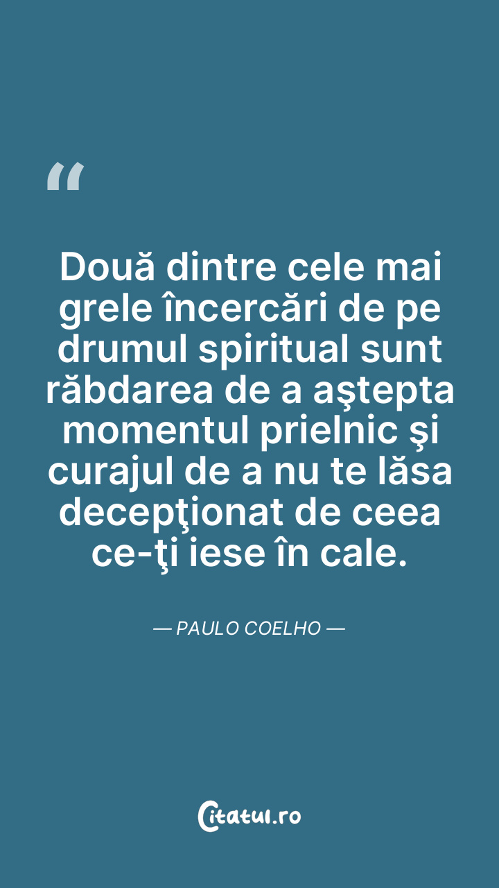 Două dintre cele mai grele încercări de pe drumul spiritual sunt răbdarea de a aştepta momentul prielnic şi curajul de a nu te lăsa decepţionat de ceea ce-ţi iese în cale. Paulo Coelho