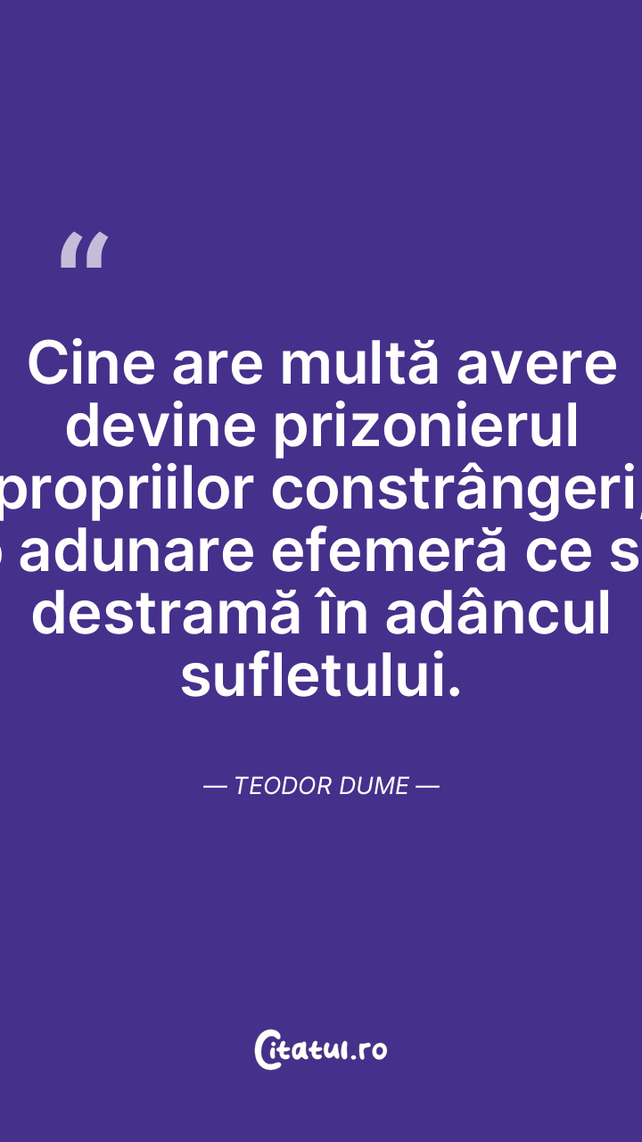 Cine are multă avere devine prizonierul propriilor constrângeri, o adunare efemeră ce se destramă în adâncul sufletului. Teodor Dume