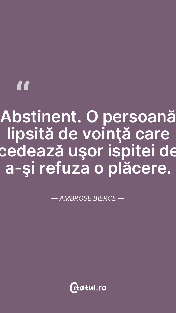 Abstinent. O persoană lipsită de voinţă care cedează uşor ispitei de a-şi refuza o plăcere. Ambrose Bierce