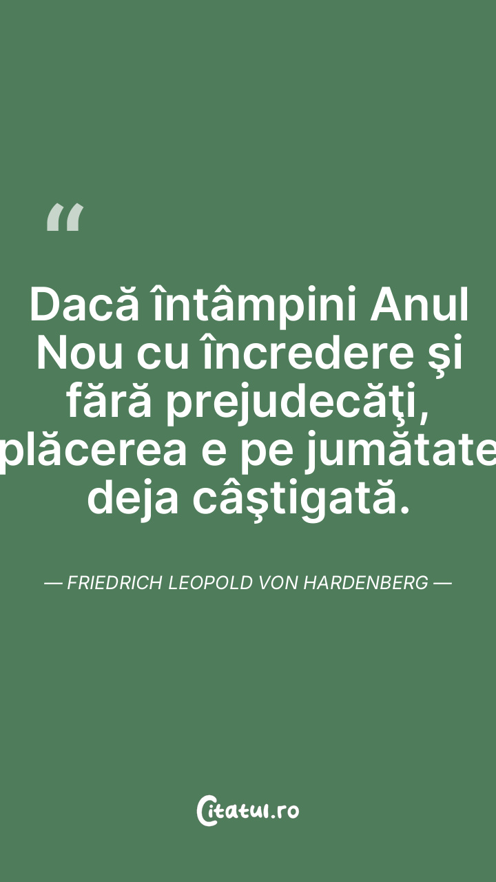 Dacă întâmpini Anul Nou cu încredere şi fără prejudecăţi, plăcerea e pe jumătate deja câştigată. Friedrich Leopold Von Hardenberg