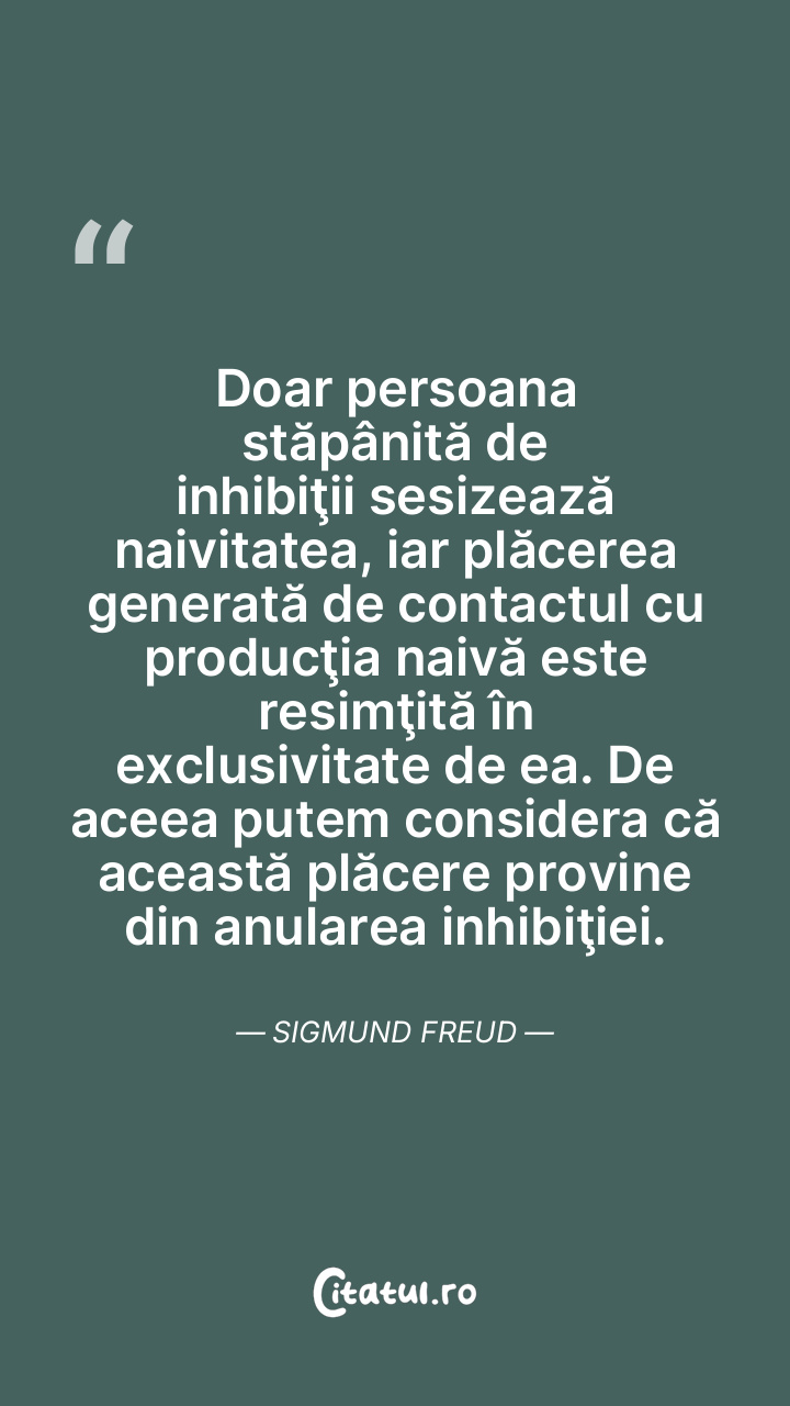 Doar persoana stăpânită de inhibiţii sesizează naivitatea, iar plăcerea generată de contactul cu producţia naivă este resimţită în exclusivitate de ea. De aceea putem considera că această plăcere provine din anularea inhibiţiei. Sigmund Freud
