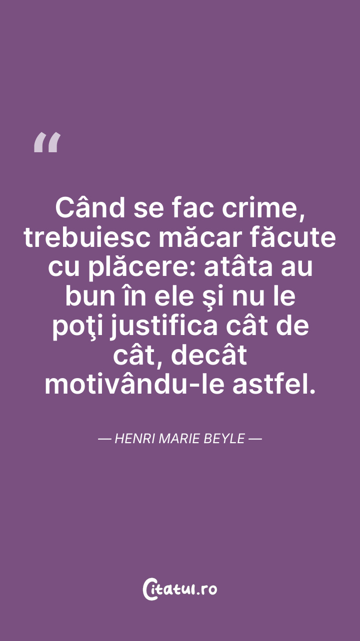 Când se fac crime, trebuiesc măcar făcute cu plăcere: atâta au bun în ele şi nu le poţi justifica cât de cât, decât motivându-le astfel. Henri Marie Beyle