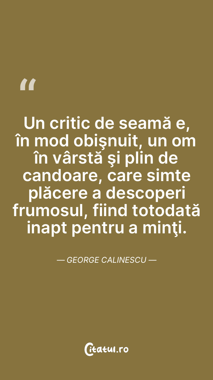 Un critic de seamă e, în mod obişnuit, un om în vârstă şi plin de candoare, care simte plăcere a descoperi frumosul, fiind totodată inapt pentru a minţi. George Calinescu