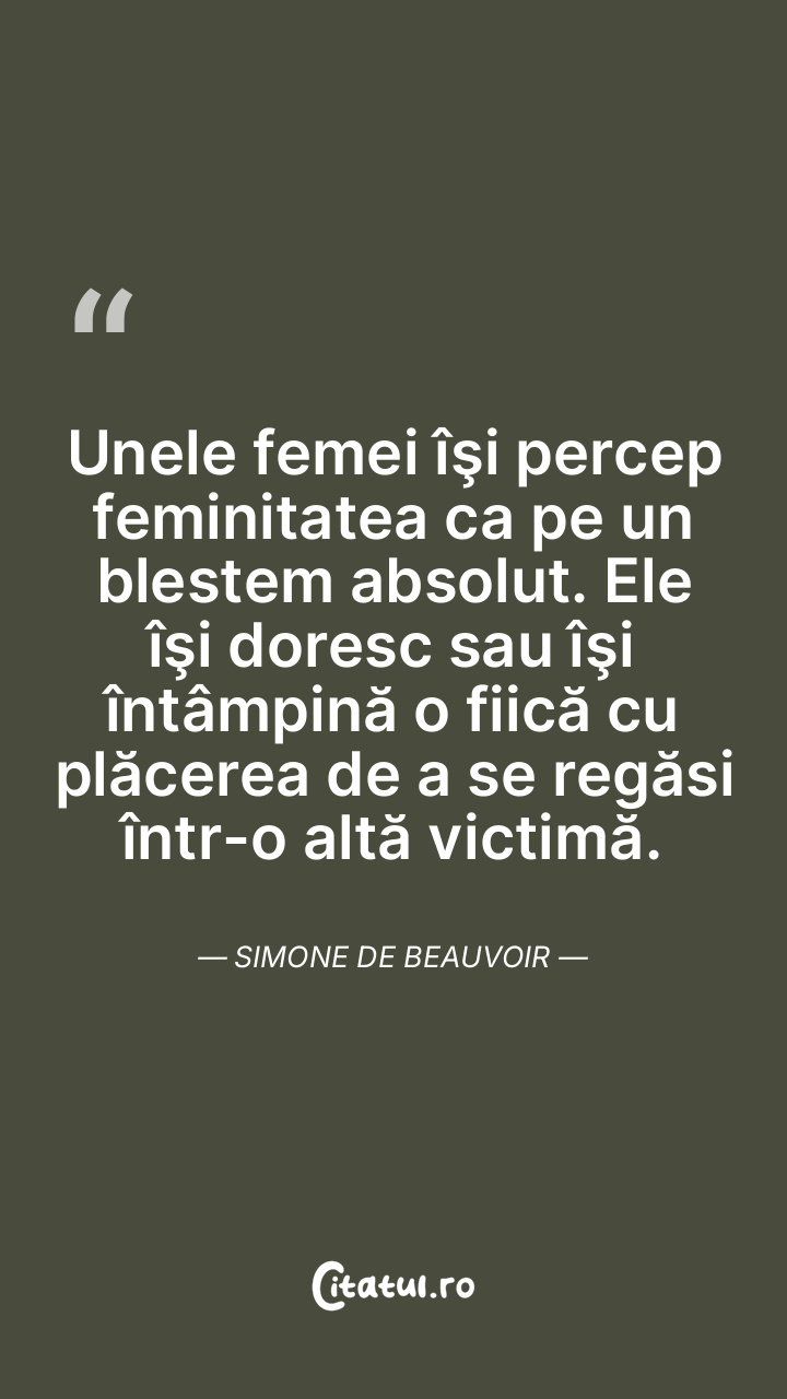 Unele femei îşi percep feminitatea ca pe un blestem absolut. Ele îşi doresc sau îşi întâmpină o fiică cu plăcerea de a se regăsi într-o altă victimă. Simone de Beauvoir