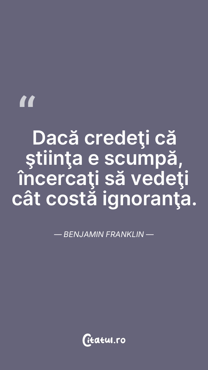 Dacă credeţi că ştiinţa e scumpă, încercaţi să vedeţi cât costă ignoranţa. Benjamin Franklin