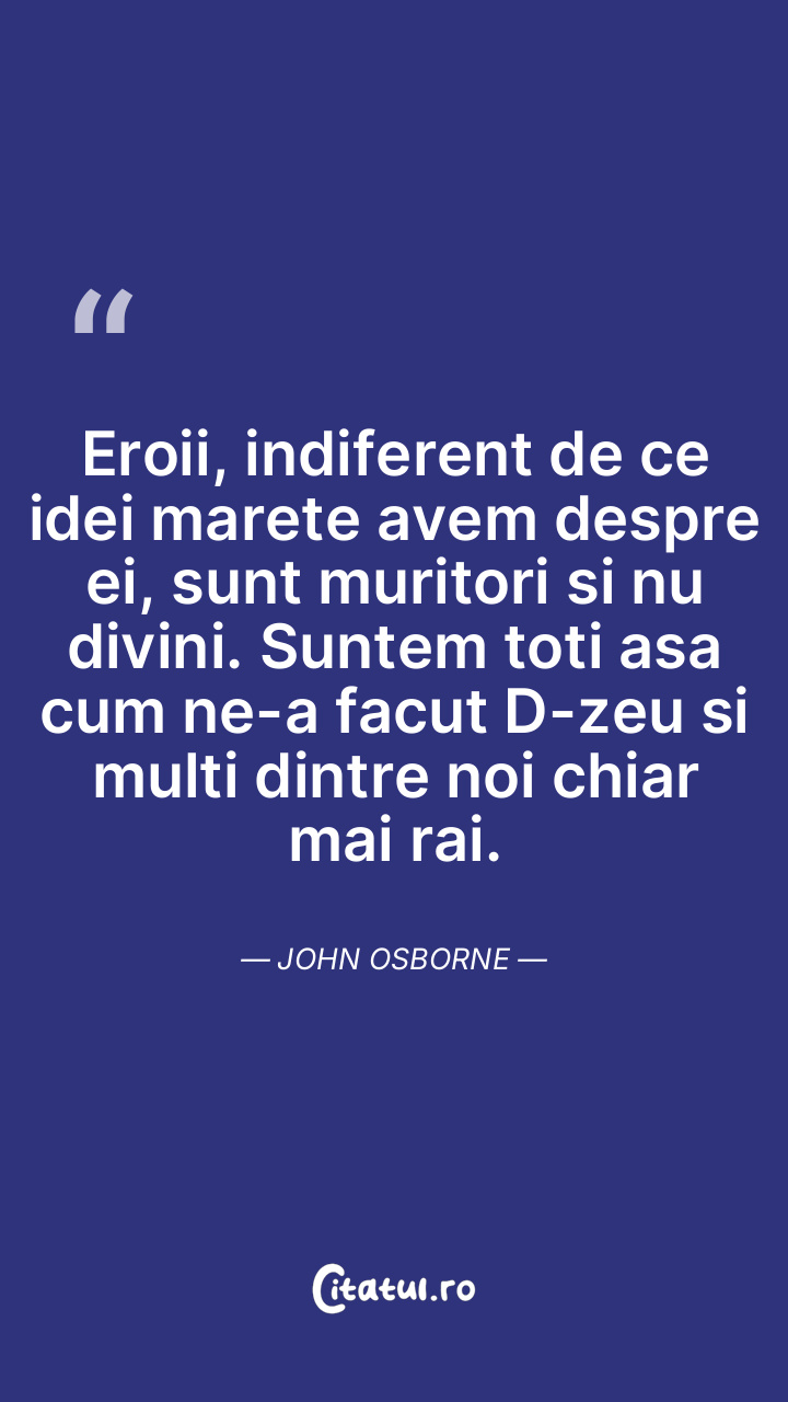 Eroii, indiferent de ce idei marete avem despre ei, sunt muritori si nu divini. Suntem toti asa cum ne-a facut D-zeu si multi dintre noi chiar mai rai. John Osborne