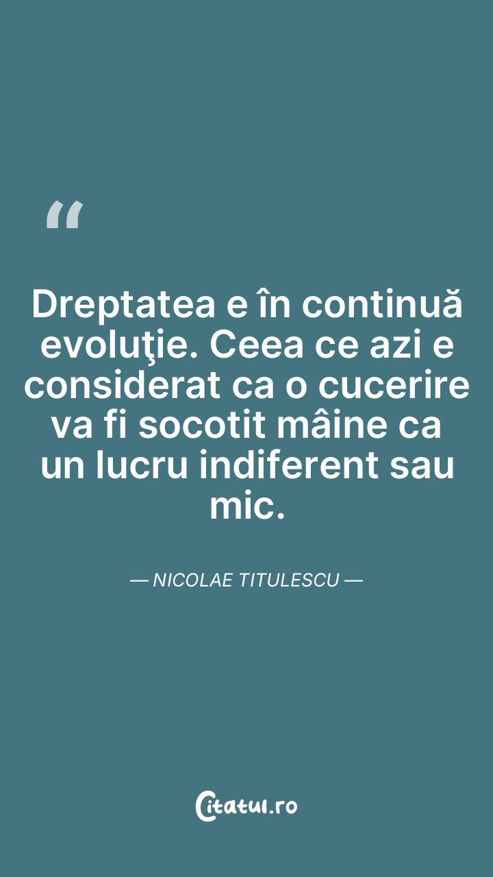 Dreptatea e în continuă evoluţie. Ceea ce azi e considerat ca o cucerire va fi socotit mâine ca un lucru indiferent sau mic. Nicolae Titulescu
