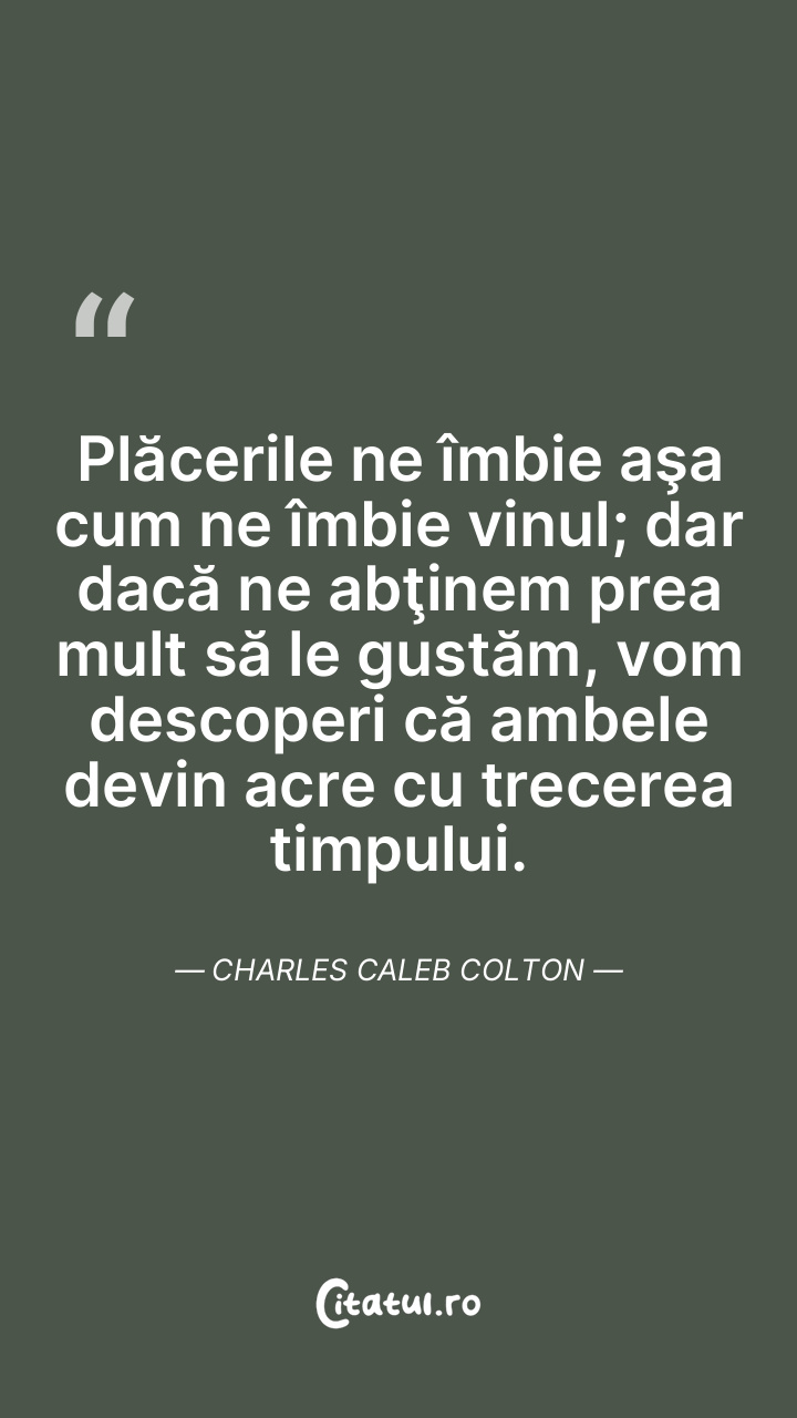 Plăcerile ne îmbie aşa cum ne îmbie vinul; dar dacă ne abţinem prea mult să le gustăm, vom descoperi că ambele devin acre cu trecerea timpului. Charles Caleb Colton
