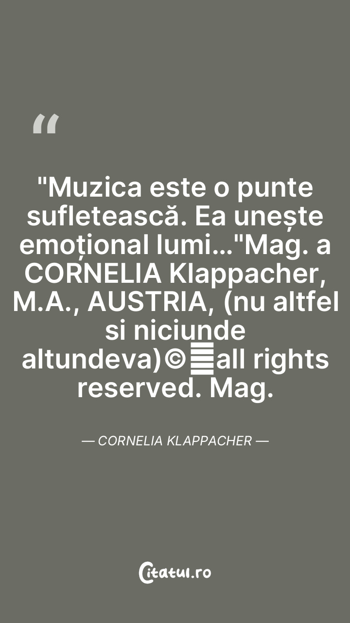"Muzica este o punte sufletească. Ea unește emoțional lumi…"Mag. a CORNELIA Klappacher, M.A., AUSTRIA, (nu altfel si niciunde altundeva)©️all rights reserved. Mag. Cornelia Klappacher