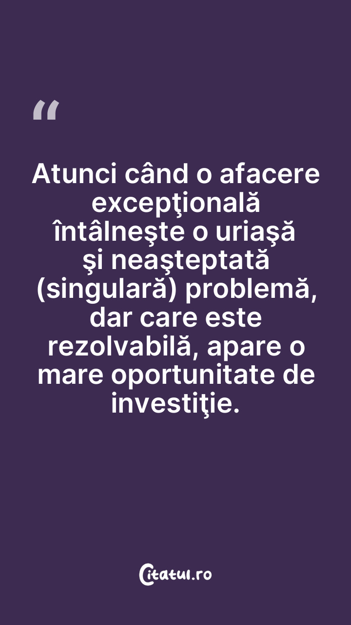 Atunci când o afacere excepţională întâlneşte o uriaşă şi neaşteptată (singulară) problemă, dar care este rezolvabilă, apare o mare oportunitate de investiţie.