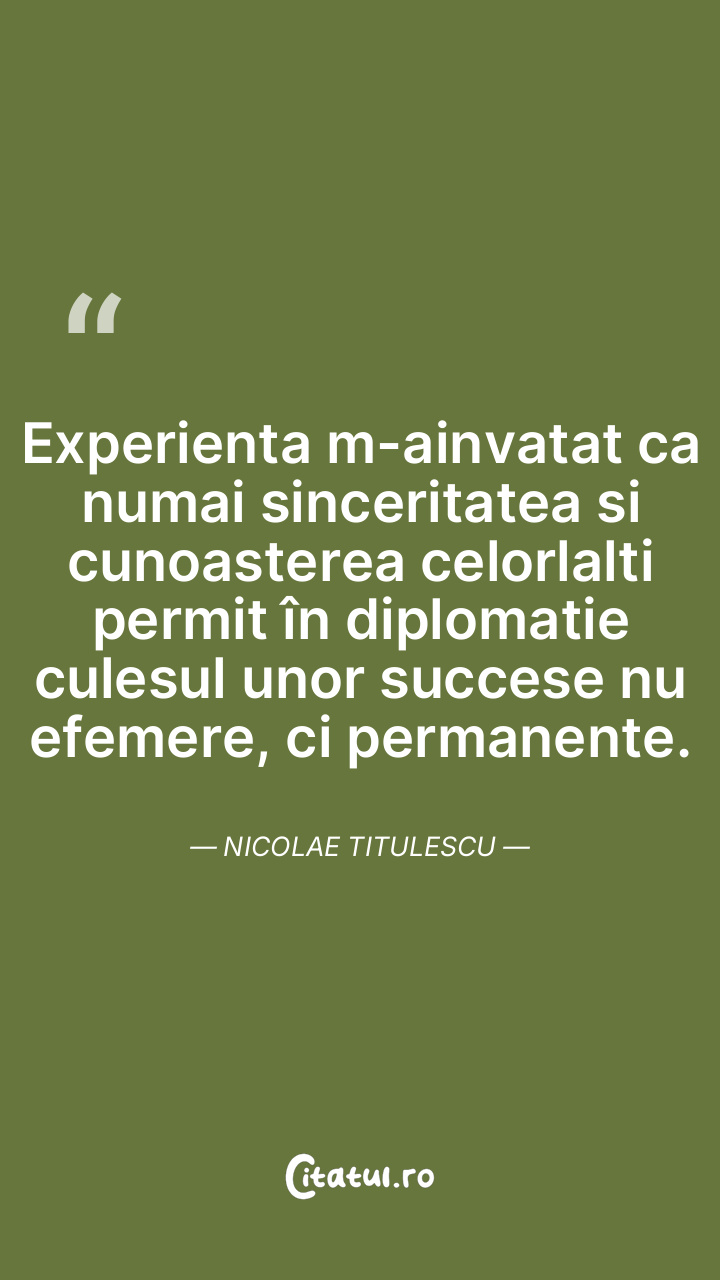 Experienta m-ainvatat ca numai sinceritatea si cunoasterea celorlalti permit în diplomatie culesul unor succese nu efemere, ci permanente. Nicolae Titulescu