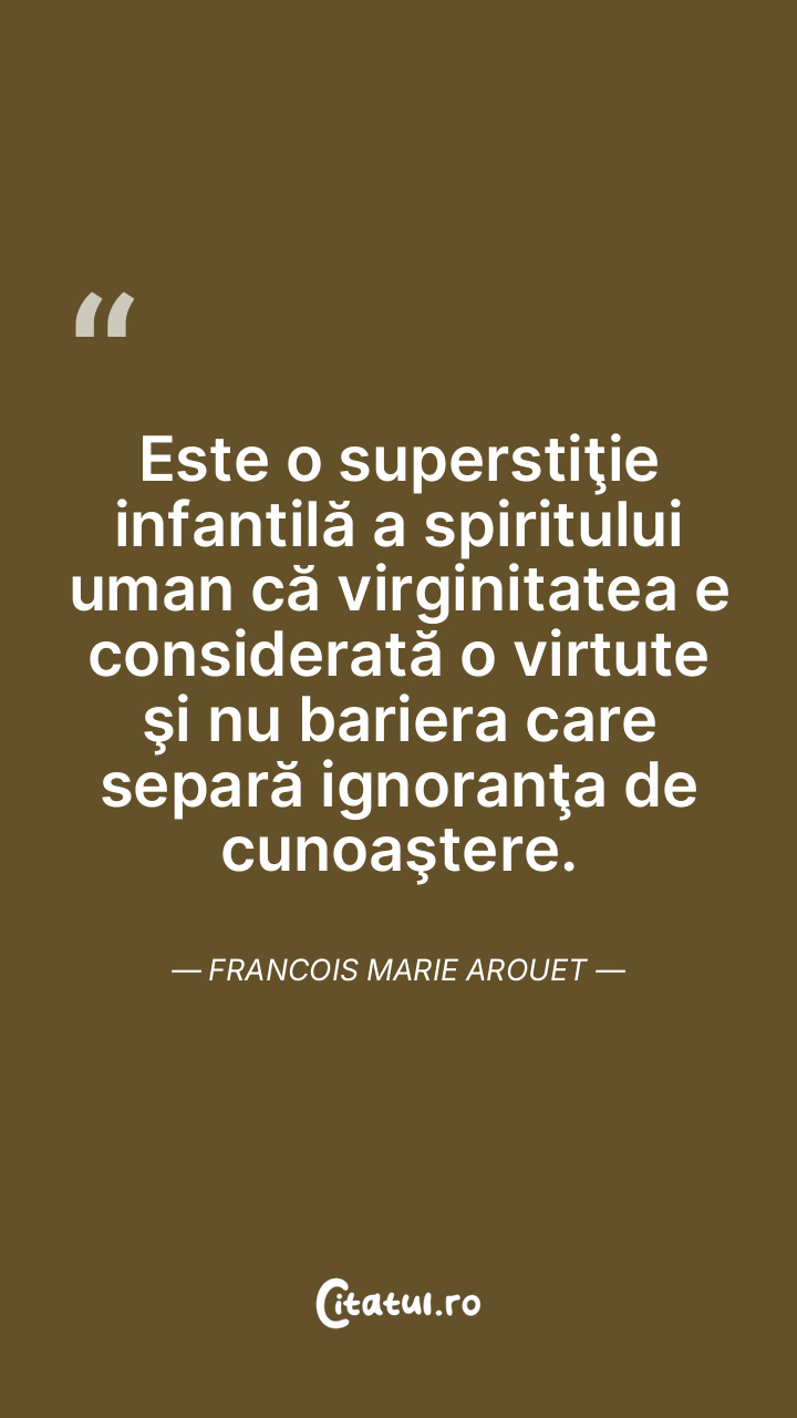 Este o superstiţie infantilă a spiritului uman că virginitatea e considerată o virtute şi nu bariera care separă ignoranţa de cunoaştere. Francois Marie Arouet