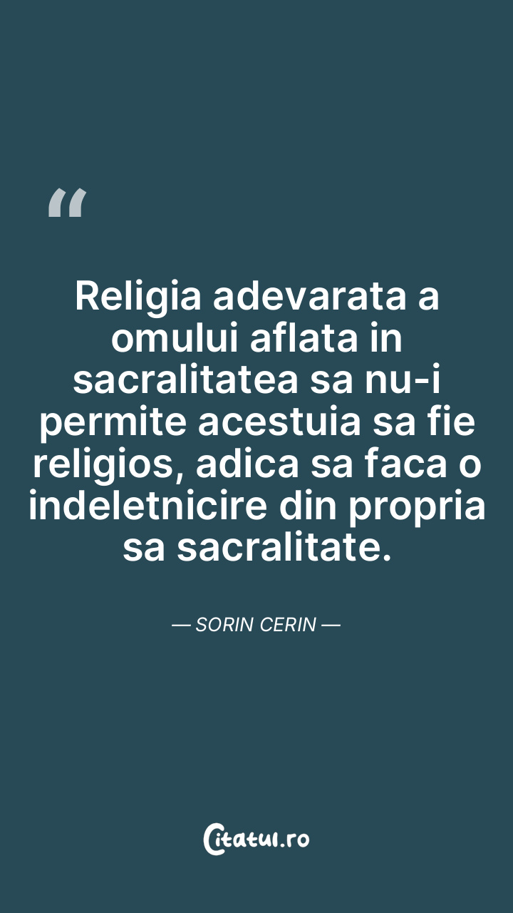 Religia adevarata a omului aflata in sacralitatea sa nu-i permite acestuia sa fie religios, adica sa faca o indeletnicire din propria sa sacralitate. Sorin Cerin