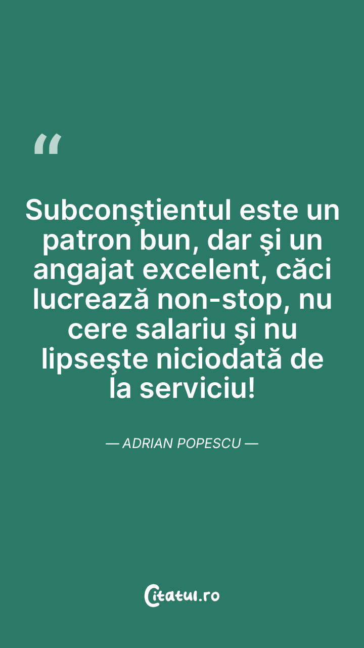 Subconştientul este un patron bun, dar şi un angajat excelent, căci lucrează non-stop, nu cere salariu şi nu lipseşte niciodată de la serviciu! Adrian Popescu