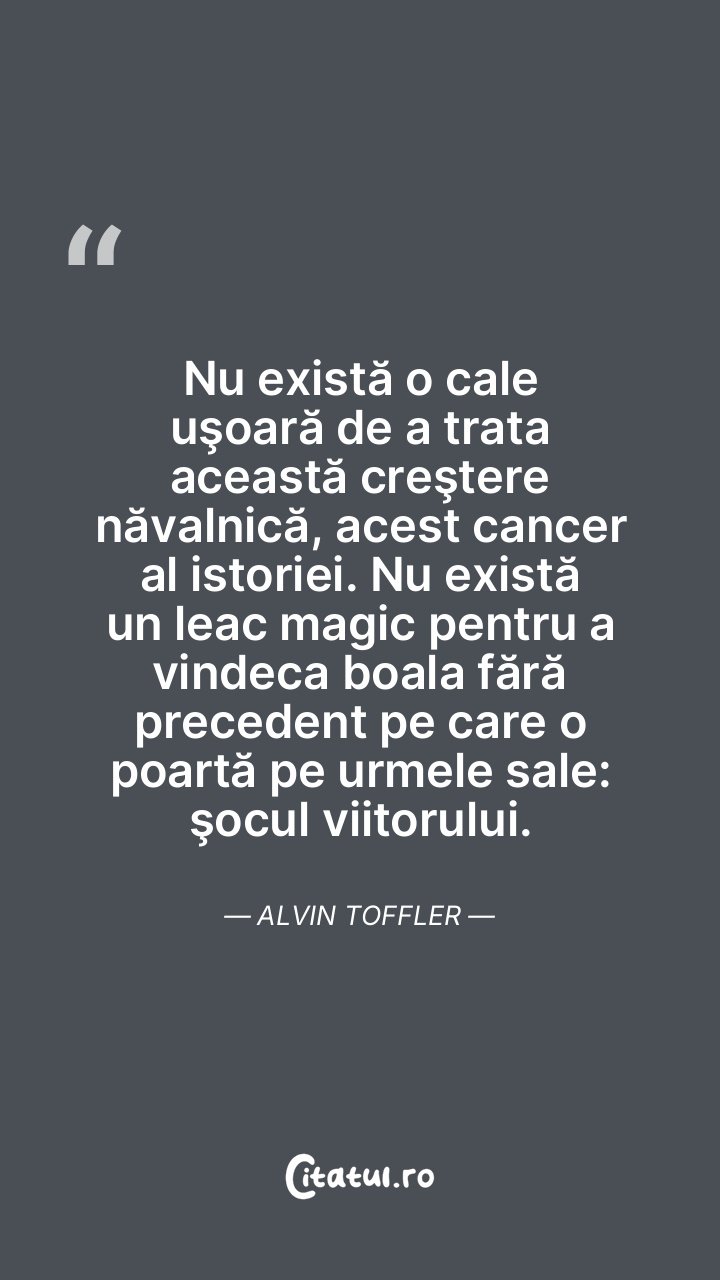 Nu există o cale uşoară de a trata această creştere năvalnică, acest cancer al istoriei. Nu există un leac magic pentru a vindeca boala fără precedent pe care o poartă pe urmele sale: şocul viitorului. Alvin Toffler