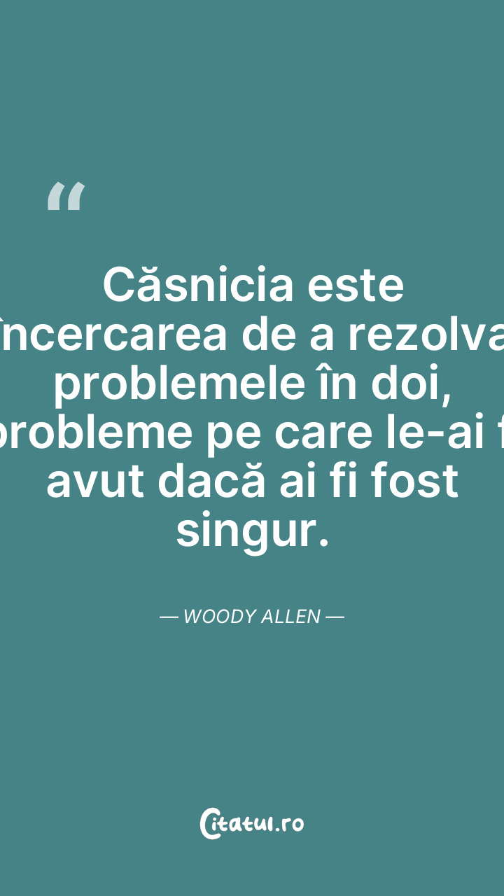 Căsnicia este încercarea de a rezolva problemele în doi, probleme pe care le-ai fi avut dacă ai fi fost singur. Woody Allen